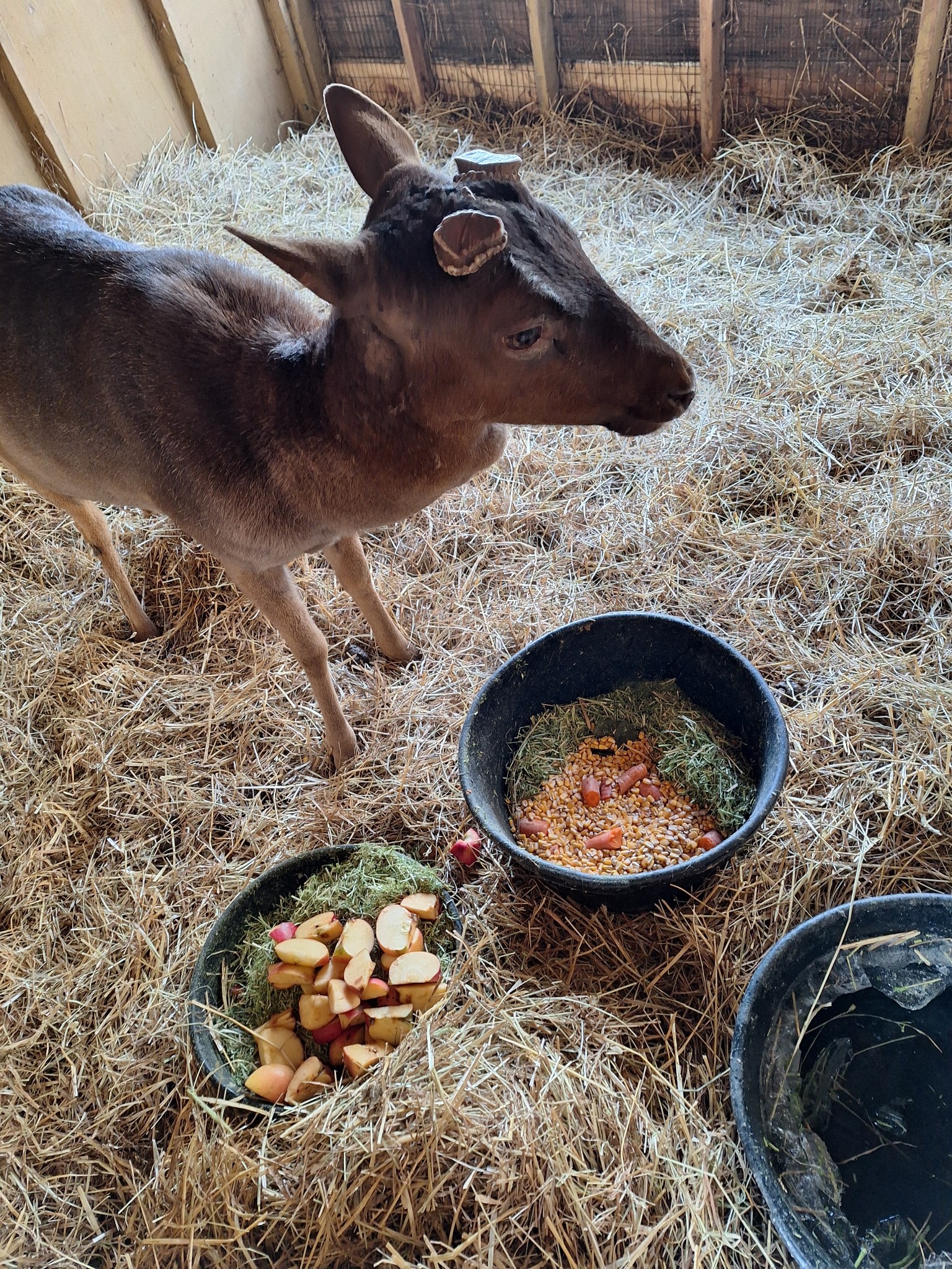 The deer will be fed shelled corn and alfalfa hay. The public is not permitted to feed the deer.